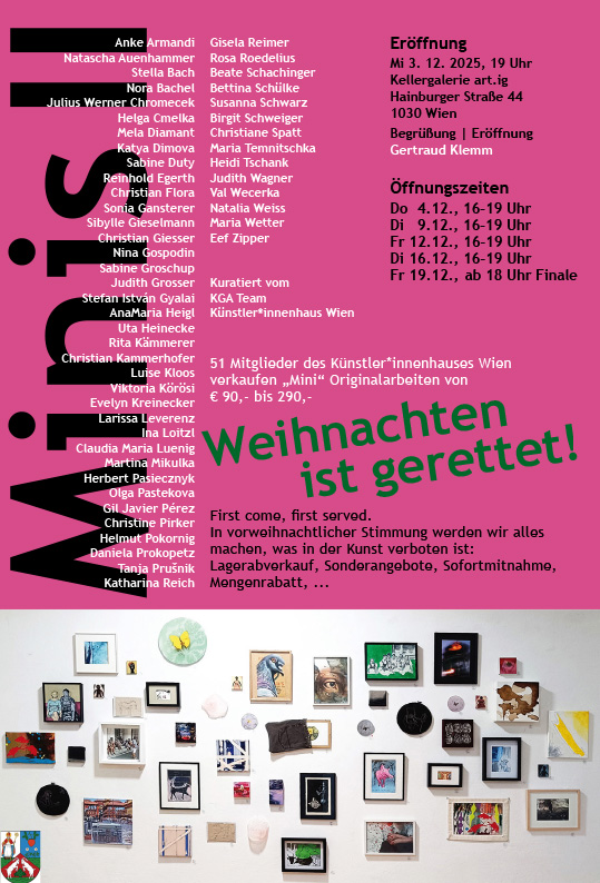 51 Mitglieder des Künstler*innenhauses Wien verkaufen MINI-Originalarbeiten ab € 90 Euro (bis 290) In vorweihnachtlicher Stimmung werden wir wieder alles machen, was in der Kunst verboten ist: